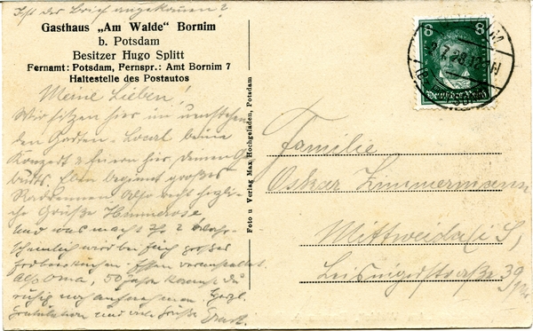 Text auf der Karte: Gasthaus "Am Walde", Bornim b. Potsdam Besitzer Hugo Splitt Entstehungszeit der Karte: gestempelt 02.07.1928 Straße und Hausnummer: Potsdamer Str. 90 Kartenart: Ansichtskarte Kartentechnik: Kupfertiefdruck Verlag: Foto u. Verlag Max Hochgeladen, Potsdam Gelaufen/ungelaufen: gelaufen Zustand (I=sehr gut bis V=mangelhaft): I Häufigkeit (h=häufig bis rrr=sehr selten): r Heutige(r) Straßenname(n): Potsdamer Straße (Bornim)