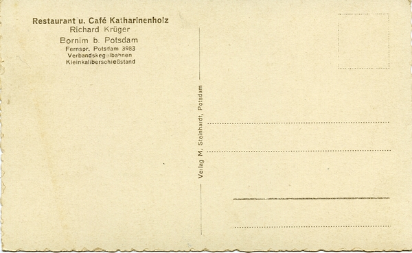 Text auf der Karte: Diese Gaststätte wurde Anno Domini 1835 als Tabagie gegründet rückseitig: Restaurant u. Café Katharinenholz Richard Krüger Bornim b. Potsdam Fernspr. Potsdam 3983 Verbandskegelbahnen Kleinkaliberschießstand Entstehungszeit der Karte: ca. 1935 Kartenart: Ansichtskarte Kartentechnik: SW-Foto Verlag: Verlag M. Steinhardt, Potsdam Gelaufen/ungelaufen: ungelaufen Zustand (I=sehr gut bis V=mangelhaft): I Häufigkeit (h=häufig bis rrr=sehr selten): h Heutige(r) Straßenname(n): Potsdamer Straße (Bornim)