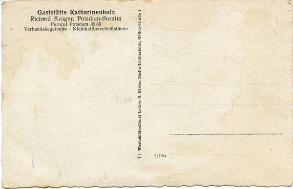 Text auf der Karte: Gaststätte Katharinenholz Richard Krüger, Potsdam-Bornim Fernruf Potsdam 3983 Verbandskegelbahn Kleinkaliberschießstände