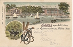 Gruss aus Nedlitz Park-Restaurant. Bes. E. Lorenz. Teleph. Amt Potsdam 696. Blick vom Parkrestaurant auf die Villenpartie. |